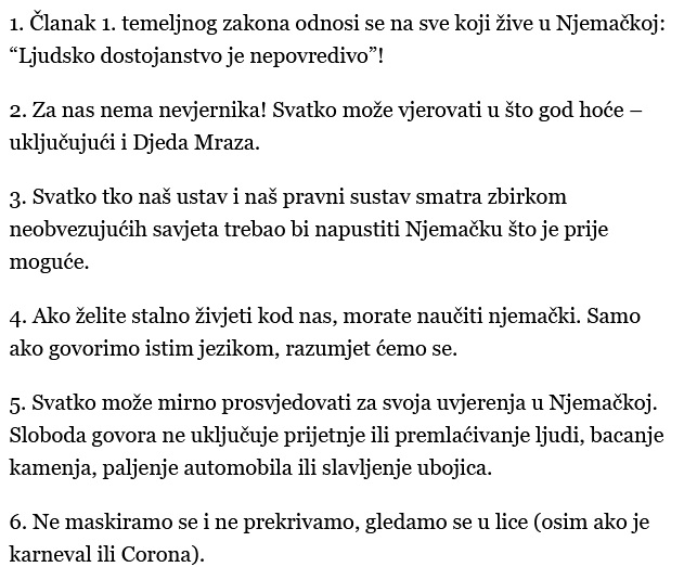 Германски весник Билд објави манифест до дојденците во земјата во кој им се објаснува дека домаќините не мислат да го сменат својот начин на живот само затоа што им дошле гости. Им се порачува дека е важно да го научат јазикот, има и лекции за бонтон. Едни одушевени од декларацијата, други велат дека е ова е лошо напишан но добро сумиран манифест на германскиот расизам