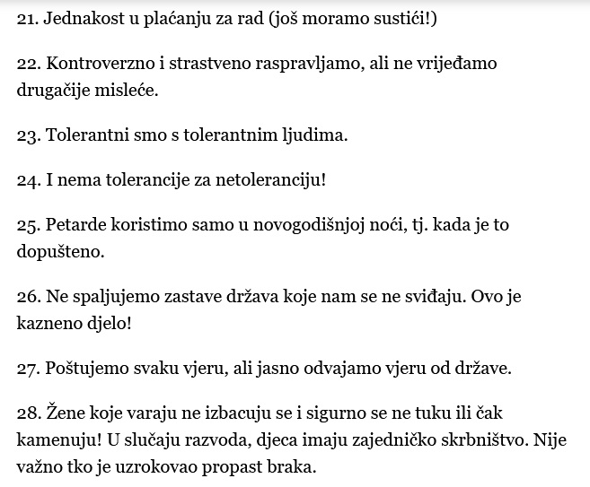 Се зборува и за важноста од учењето германски јазик, почитувањето на верските слободи и некористењето на социјалната помош како примарен извор на приход.